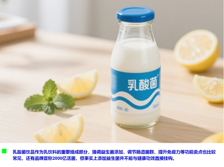 乳酸菌饮品作为乳饮料的重要组成部分,强调益生菌添加、调节肠道菌群、提升免疫力等功能卖点也比较常见,还有品牌宣称2000亿活菌,但事实上添加益生菌并不能与健康功效直接挂钩,益生菌要发挥作用需保证足够的活菌数量,而且从生产到销售再到饮用需经过多重环节,若受外界因素影响或储存条件不当益生菌活性都会大打折扣。